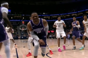 GIF-威少崴脚本来前场球,鹈鹕挑战失败补吹了琼斯犯规,威少获得两罚,全部命中继续打