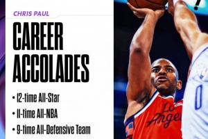 职业生涯21年,保罗可谓是荣誉满身,他12次入选全明星,11次入选最佳阵容(4次一阵,5次二阵,2次三阵),9次入选最佳防守阵容(7次一防,2次二防),当选过最佳新秀、全明星MVP,五次拿到助攻王,六次抢断王,入选NBA75大巨星。