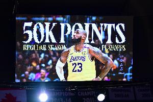 2025年3月5日,湖人主场136-115大胜鹈鹕豪取七连胜。首节比赛,詹姆斯在外线首次出手就命中三分,职业生涯总得分突破50000分(常规赛41838分+季后赛8162分)里程碑,他也是NBA至今唯一达成此成就的球员。