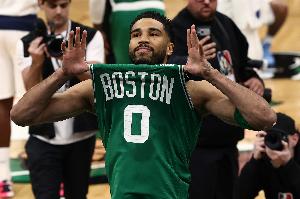 上半场,塔图姆出场14分07秒8投2中,三分4中1,得到5分5篮板5助攻,正负值+5。